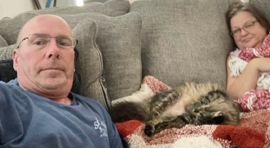 “Hayley has adapted well in her 5 weeks with us. She has relaxed quite a bit and we think is enjoying her new home. As you can see from the pictures she has her own spot for TV time and comes and lets us know when it’s TV/nap time. She enjoys playing hide & seek in the mornings and evenings. She is still scared of any toys that make noise but she has a few mice and fuzzy balls that she plays with frequently.”