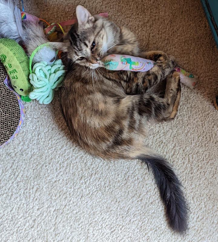 She’s very well behaved and doesn’t let the boy cats boss her around. And she’s gotten much more comfortable staying out in common areas when family members come over.