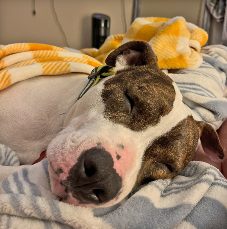Mojo is the best, he wants nothing but snuggles, hugs, and kisses. He LOVES car rides and loves to go on the boat! He loves his life jacket so he can jump off with the kids and swim with them! He loves to snuggle with his cat sister! His favorite car rides are to the fire department to see dad and all his coworkers – he loves to play ball with them at the station! Mojo goes everywhere with us possible! He loves trips to grandmas! He also loves walks we go on long walks twice a day! He’s getting along great! He loves his blanket – he carries around his yellow blanket with him all around the house.