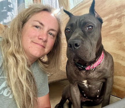 When Maya arrived at the County Shelter, she was terrified and shut down. Pictured here with her adopter, Sara, the extremely timid dog is gaining confidence in her new home and learning to accept human affection.