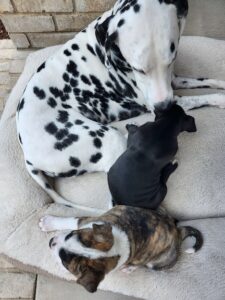 Medical foster dogs usually cannot play with other pets while healing, but many do just fine resting nearby. Colby’s foster, Marjorie, has both a dog and a cat — all quiet, respectful companions. Most days, Colby simply snoozed on his dog bed.